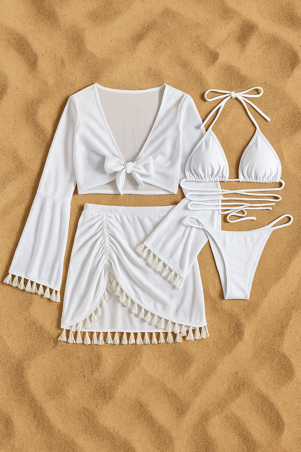Ocean Pearl – Maillot de bain 4 pièces chic : haut triangle, bas échancré, jupe & surchemise